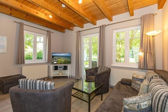 Kurzbeschreibung: Herzlich willkommen in unserem Ferienpark "Seepferdchen" in Nienhagen! Verbringen Sie erholsame Urlaubstage im stilvollen, familienfreundlichen Haus "Usedom 7a". Die Nähe zum Meer sowie div. Freizeitangebote garantieren Ihnen unvergessliche Urlaubstage. Lagebeschreibung: Das direkt an der Küste gelegene Ostseebad Nienhagen liegt zwischen Warnemünde und Heiligendamm. Weite Felder und ein großer Mischwald umgeben den seit 1906 bestehenden Badeort. Bei ausgedehnten Spaziergängen oder Fahrradtouren durch den legendären "Gespensterwald" bekommen Sie einen vielfältigen Eindruck von der traumhaften Landschaft, den naturbelassenen Wäldern und bezaubernden Umgebung. An den weitläufigen Stränden und bizarr anmutenden Steilküsten lassen sich Entspannung suchende Urlauber den Wind um die Nase wehen und genießen das zu jeder Zeit reizvolle Ostseeklima. Im nur ca. 300 m von der Anlage entfernten Ortszentrum finden Sie Restaurants, Cafés, Bäckereien und für den kleinen Einkauf einen "Tante-Emma-Laden". Nur 5 Minuten entfernt, ebenfalls im Ort, befindet sich ein "Edeka", wo Sie alles für den täglichen Bedarf erhalten. Auf der Anlage befindet sich für die kleinen Gäste ein großer Kinderspielplatz mit zahlreichen Spielgeräten, hier können die Kleinen sich so richtig austoben. Ein kleiner Minigolf-Platz sowie eine Schachspiel-Fläche im Freien bieten ein paar vergnügliche Stunden für Jung und Alt. Für die sportlich aktiven Gäste stehen sowohl ein Tischtennisplatz als auch ein Beachvolleyball-Feld zur Verfügung. Hier ist Fitness angesagt. Ausstattungen: Eintreten und wohl fühlen! Für 4 bis 6 Personen bietet Ihnen dieses Ferienhaus auf 66 m² Wohnfläche, verteilt auf 2 Ebenen, ausreichend Platz für erholsame Urlaubstage an der Ostsee. Im lichtdurchfluteten und geschmackvoll möblierten Wohnzimmer im Erdgeschoss können Sie es sich mit der ganzen Familie gemütlich machen. Es bildet den Mittelpunkt des Hauses für ein gemeinsames Beisammensein. Das Wohnzimmer ist mit zwei komfortablen Sesseln und einer Sofa-Garnitur eingerichtet. Diese ist ausziehbar und kann als Schlafmöglichkeit für 2 Personen genutzt werden. Für Ihre abendliche Unterhaltung stehen Ihnen ein Smart-TV sowie eine HiFi-Anlage zur Verfügung. An das Wohnzimmer schließt sich der offene Küchenbereich an. Dieser beinhaltet einen großen Esstisch mit 6 Stühlen sowie die moderne und voll ausgestattete Küche, in der Sie schnell und einfach Ihre Lieblingsmahlzeit zaubern können. Im Eingangsbereich befindet sich ein separater Abstellraum, hier können Sie Ihre Koffer und andere Urlaubsutensilien verstauen. Im Obergeschoss, das über eine Wendeltreppe erreichbar ist, befinden sich zwei getrennte Schlafzimmer, jeweils mit einem Doppelbett und einem geräumigen Kleiderschrank für Ihre Urlaubsgarderobe eingerichtet. In einem der beiden Schlafzimmer befindet sich ein zusätzlicher Smart-TV Ebenso auf dieser Ebene befindet sich das Badezimnmer, ausgestattet mit einer Dusche, einem WC, einem Waschbecken mit Unterschrank sowie Ablageflächen für Ihre Badutensilien.