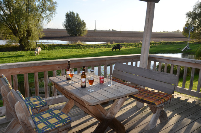 Das Holzhaus befindet sich in Neuendorf, nur 250 m vom Bodden mit herrlich gelegener Badestelle und Yachthafen, entfernt. Auf dem Gelände befindet sich ein rustikaler Lagerfeuer- und Grillplatz, ein Saloon sowie in kleiner Streichelzoo und Fahrradverleih. Für Angler liegt am Hafen ein Angelboot bereit.